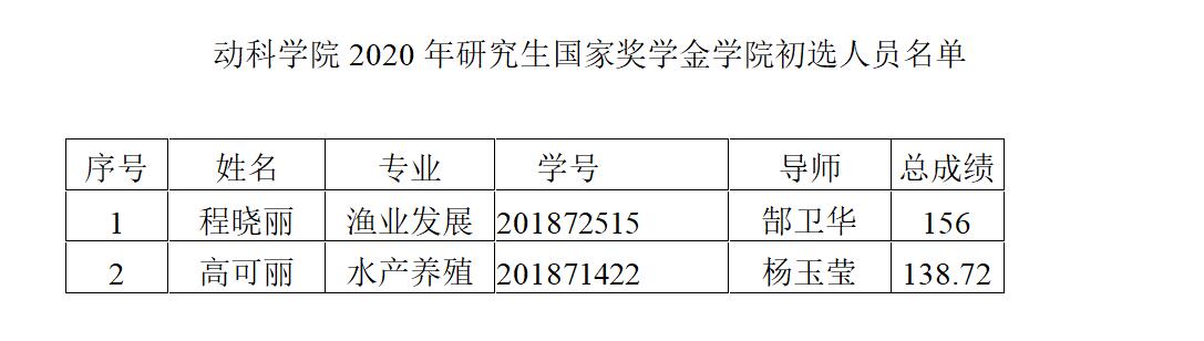 根据《财政部教育部关于印发研究生国家奖学金管理暂行办法的通知》(财〔2012〕342 号)、《教育部 财政部关于印发普通高等学校研究生国家奖学金评审办法的通知》(教财〔2014〕1 号)等文件精神,和《304am永利集团研究生国家奖学金管理办法》要求,经学院研究生国家奖学金评审委员会审核、评审答辩以及研究生代表进行投票,最终推选出两名研究生。现将我院2020年研究生国家奖学金学院初选人员名单予以公示,公示日期:2020年10月23日-29日。若对公示名单有异议,请于公示期内与学院联系,联系电话:0716-8061776。