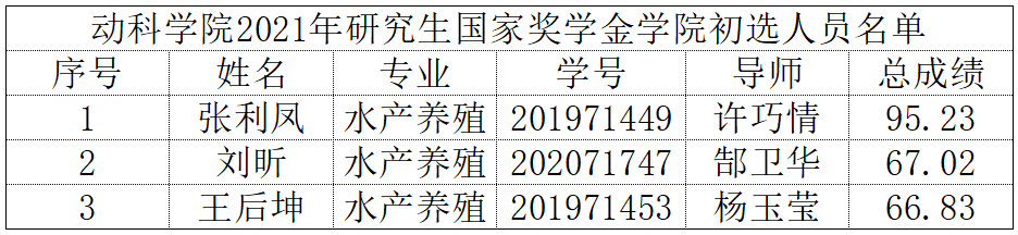根据《304am永利集团关于开展2021年研究生国家奖学金评审工作的通知》文件精神及有关规定,经学院研究生国家奖学金评审委员会审核、评审答辩以及研究生代表进行投票,最终推选出三名研究生。现将我院2021年研究生国家奖学金学院初选人员名单予以公示,公示日期:2021年10月20日-25日。若对公示名单有异议,请于公示期内与学院联系,联系电话:0716-8061776。