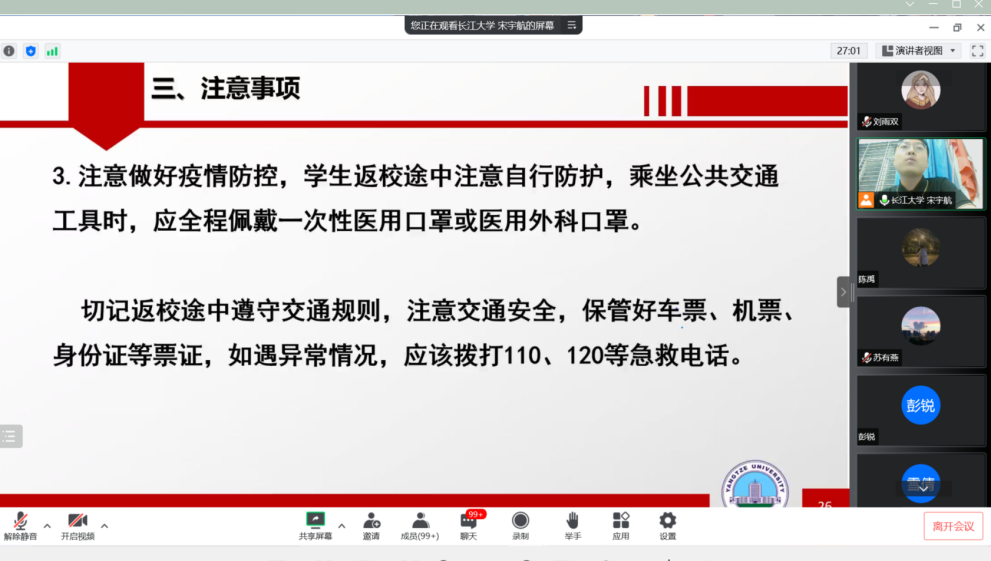 (通讯员:刘雨双 宋宇航)为深入贯彻落实学校安全教育政策,迎接2022级新生入学。8月24日晚7时,关于22级辅导员宋宇航召开线上班会,以入学安全教育为主题,邀请新生与家长们共同参与。